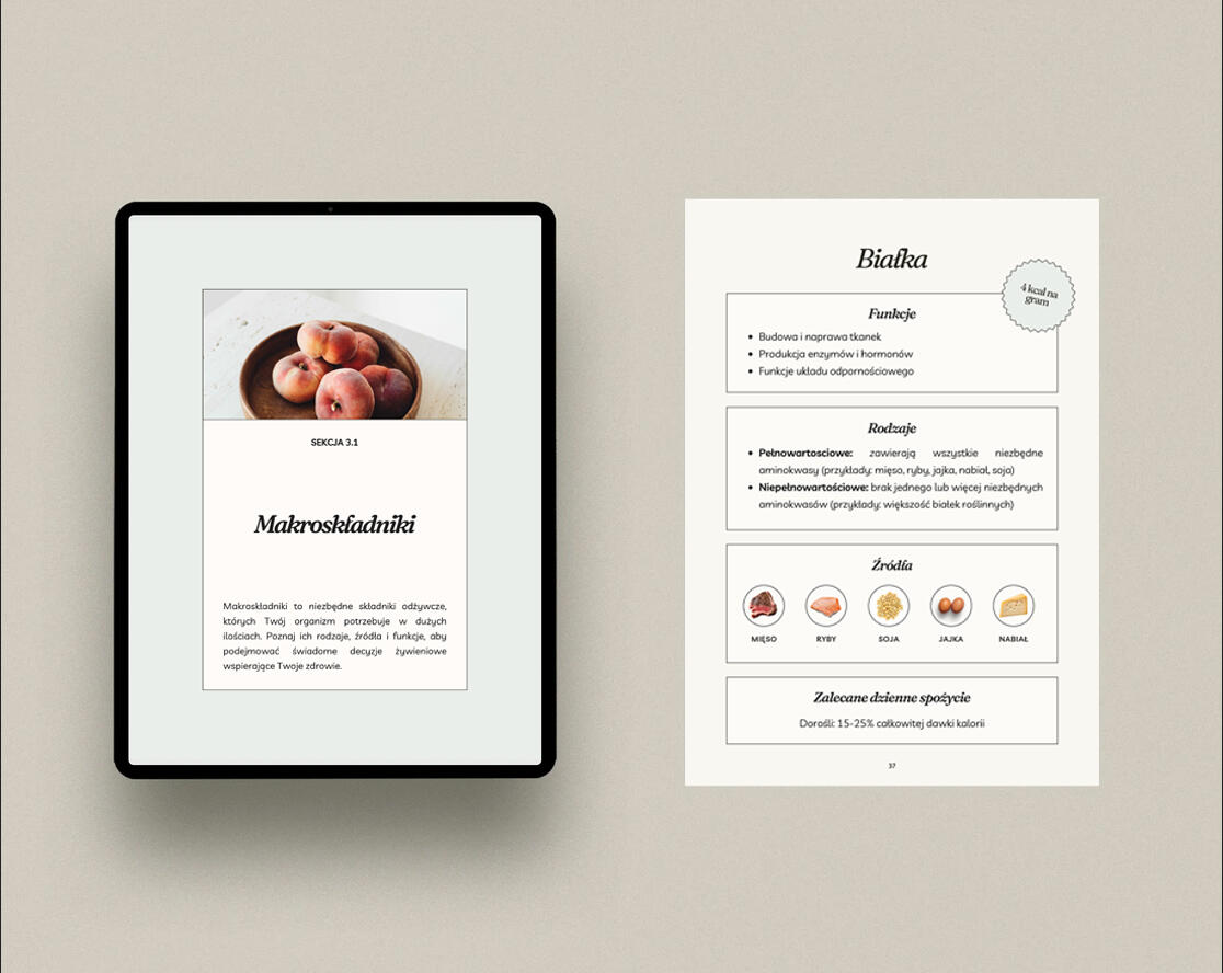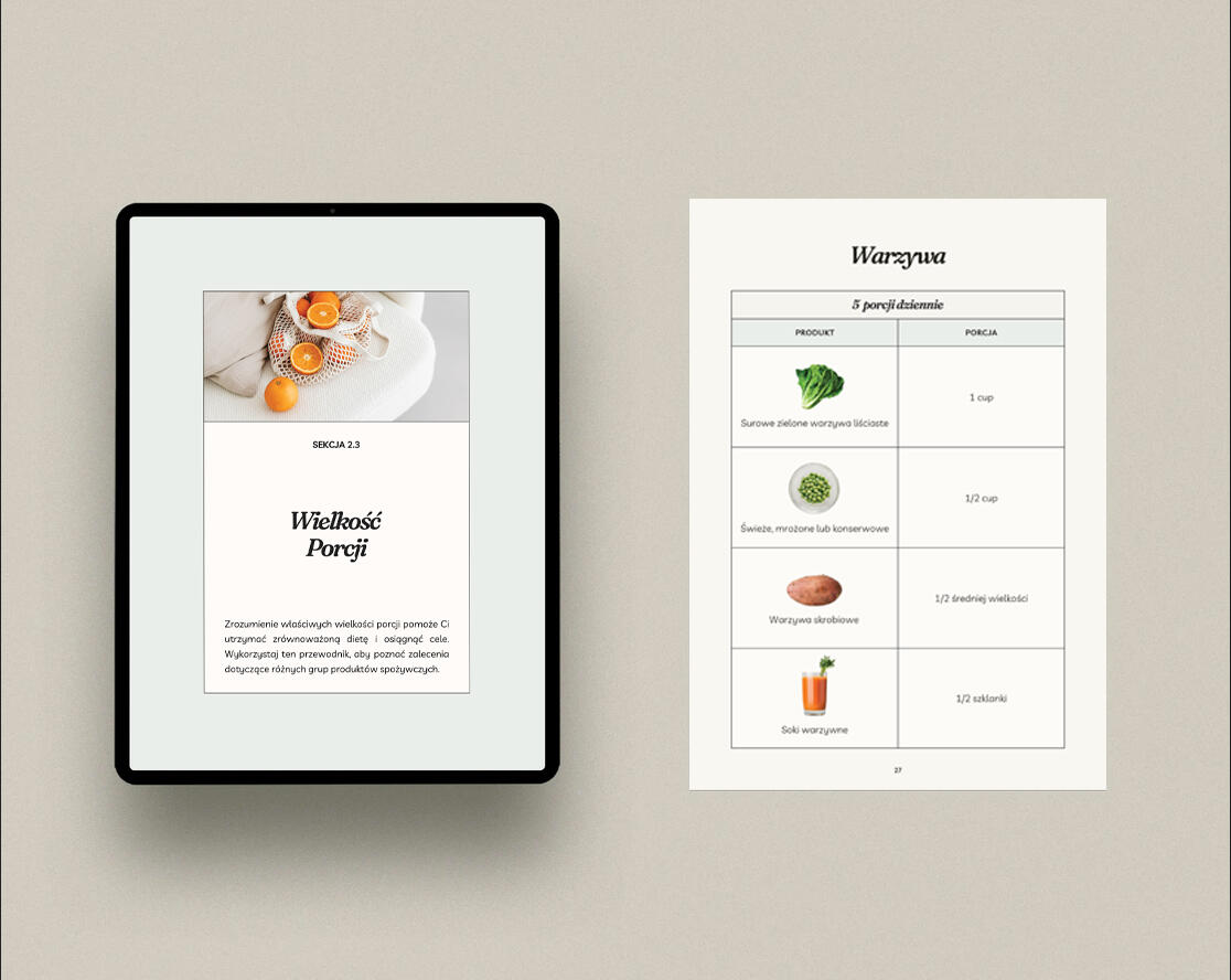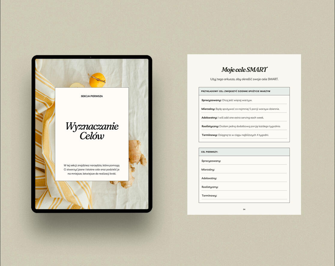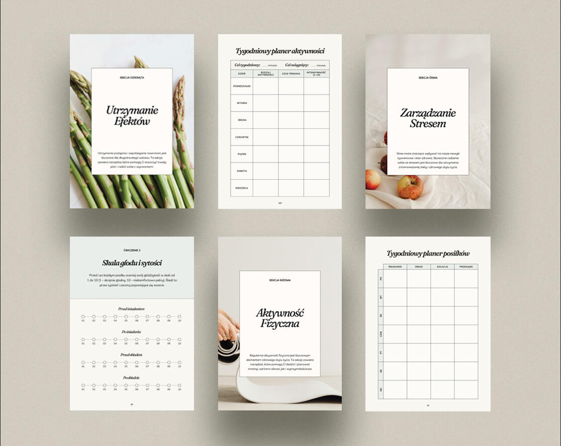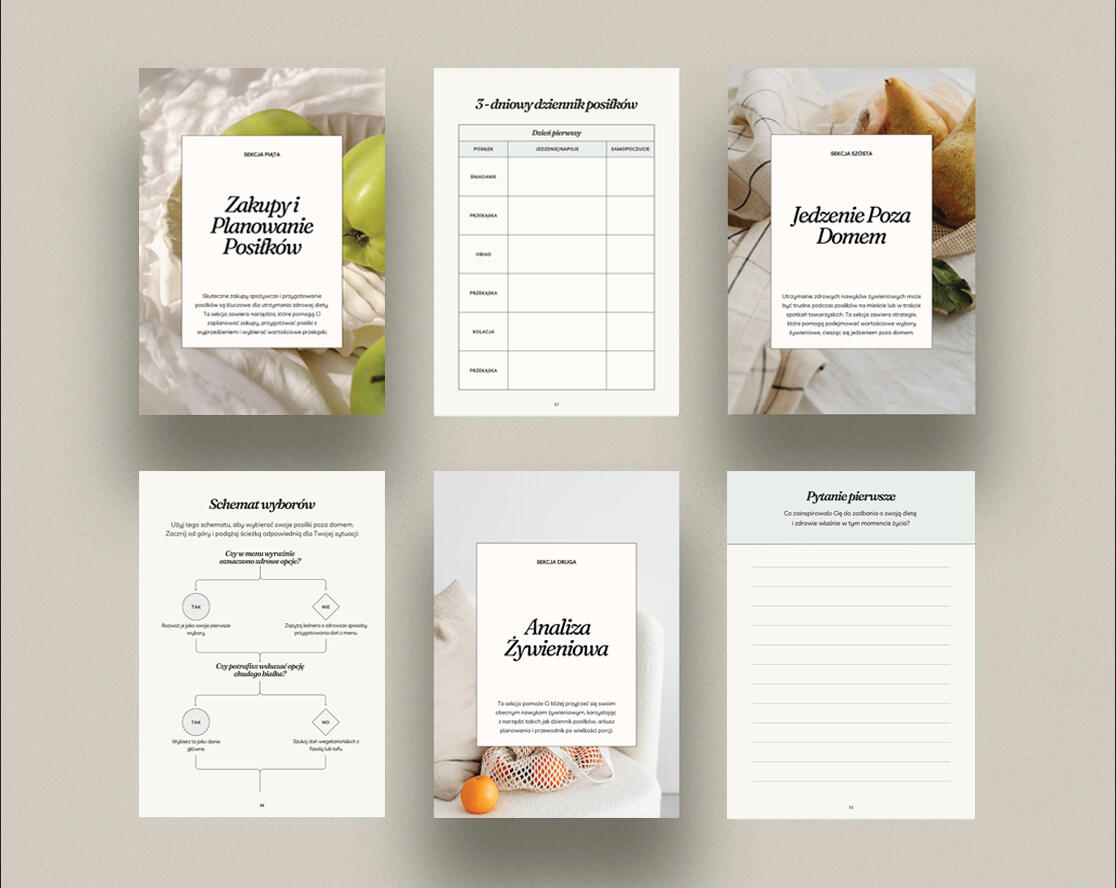 Otrzymujesz gotowe arkusze, checklisty i plany, które pomagają Ci przejąć kontrolę nad odżywianiem, planowaniem posiłków i własnymi nawykami.