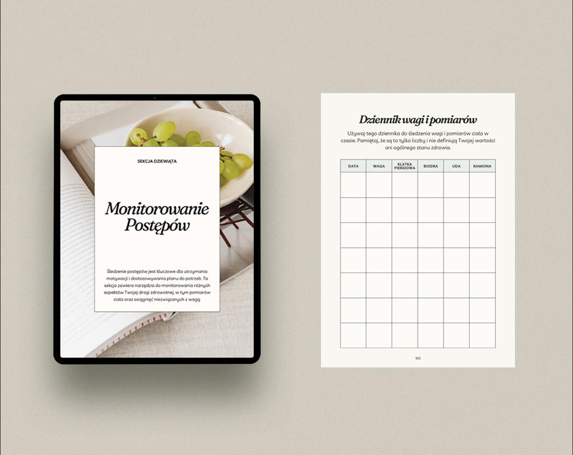 Masz arkusze do monitorowania wagi i pomiarów, postępów tygodniowych i miesięcznych, osiągnięć niezwiązanych z wagą, samopoczucia, energii i nastroju. Widzisz, jak zmienia się Twoje ciało i Twoje życie.